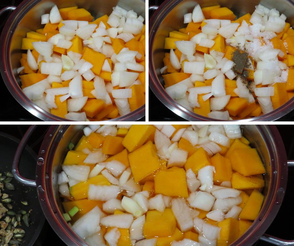- Coloque numa panela todos os ingredientes com excepção do azeite, croutons, sementes de abóbora e hortelã.