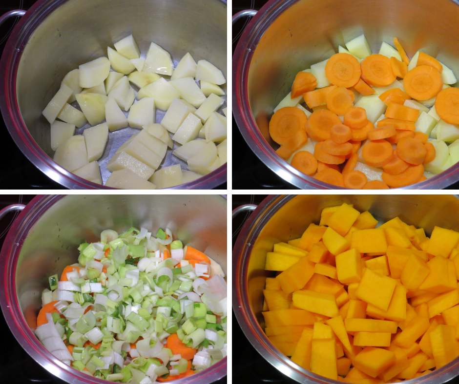 - Ingredientes: Batata, cenoura, alho-francês, abóbora