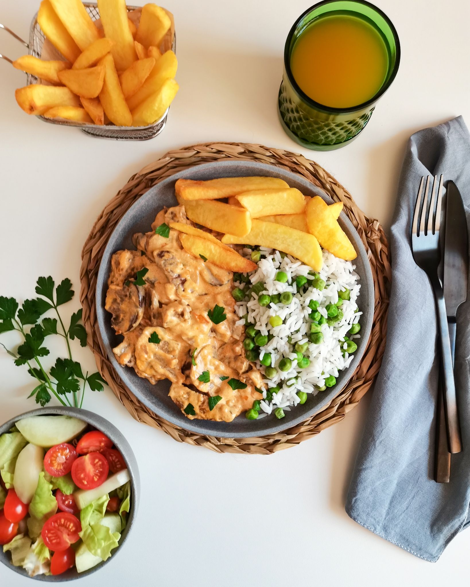 - Está pronto! Acompanha com o que mais gostares. Aqui, a nossa sugestão é com arroz com ervilhas, batatas fritas e uma variada salada.