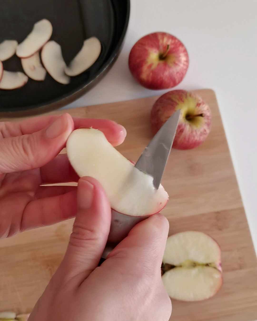 - Corta as maçãs em fatias finas.
