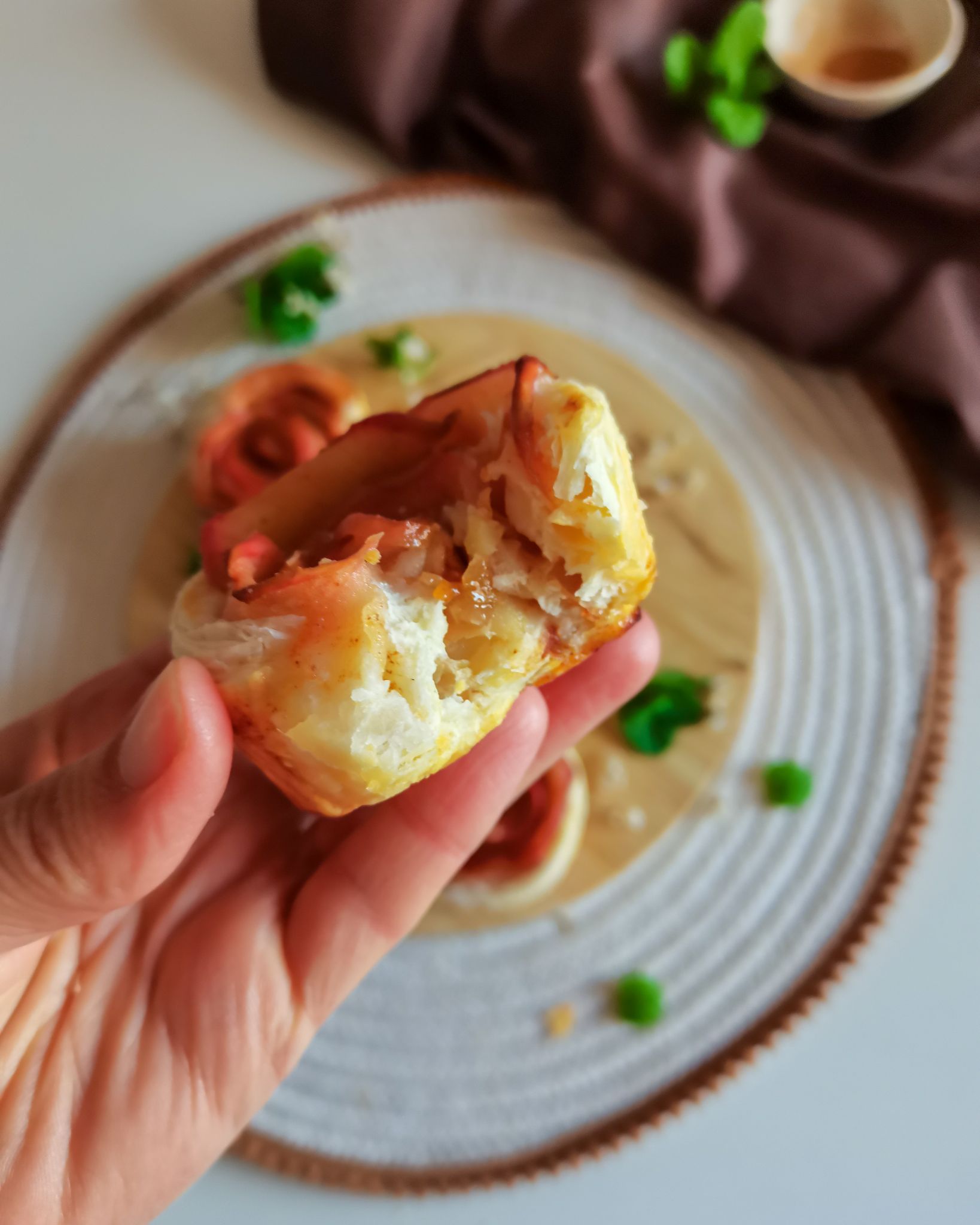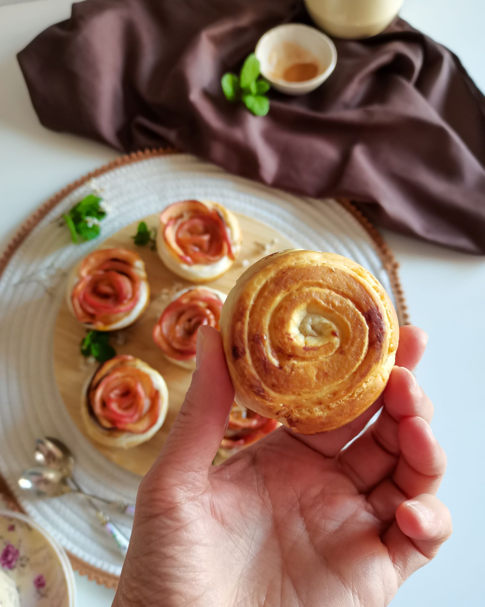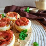 - Dobra o rebordo inferior da massa para cima das fatias e enrola cuidadosamente formando uma rosa.