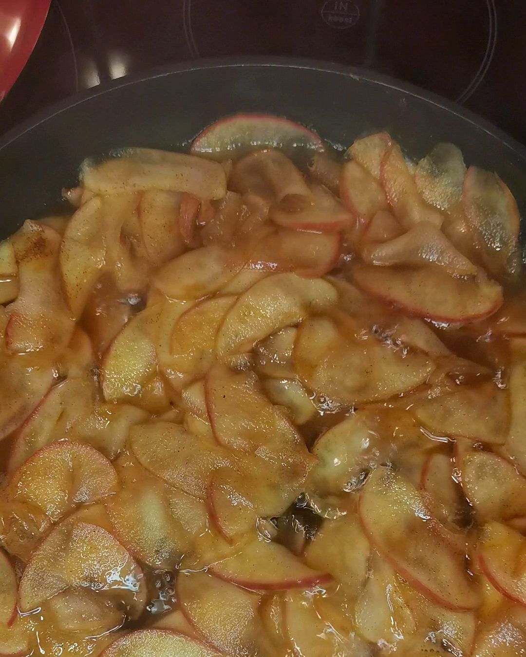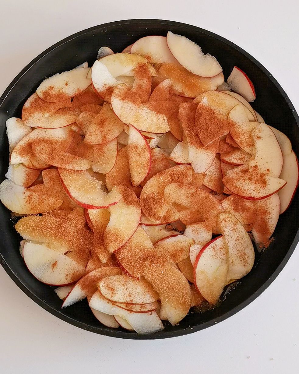 - Na frigideira: água, sumo de limão, fatias de maçã, açúcar e canela.