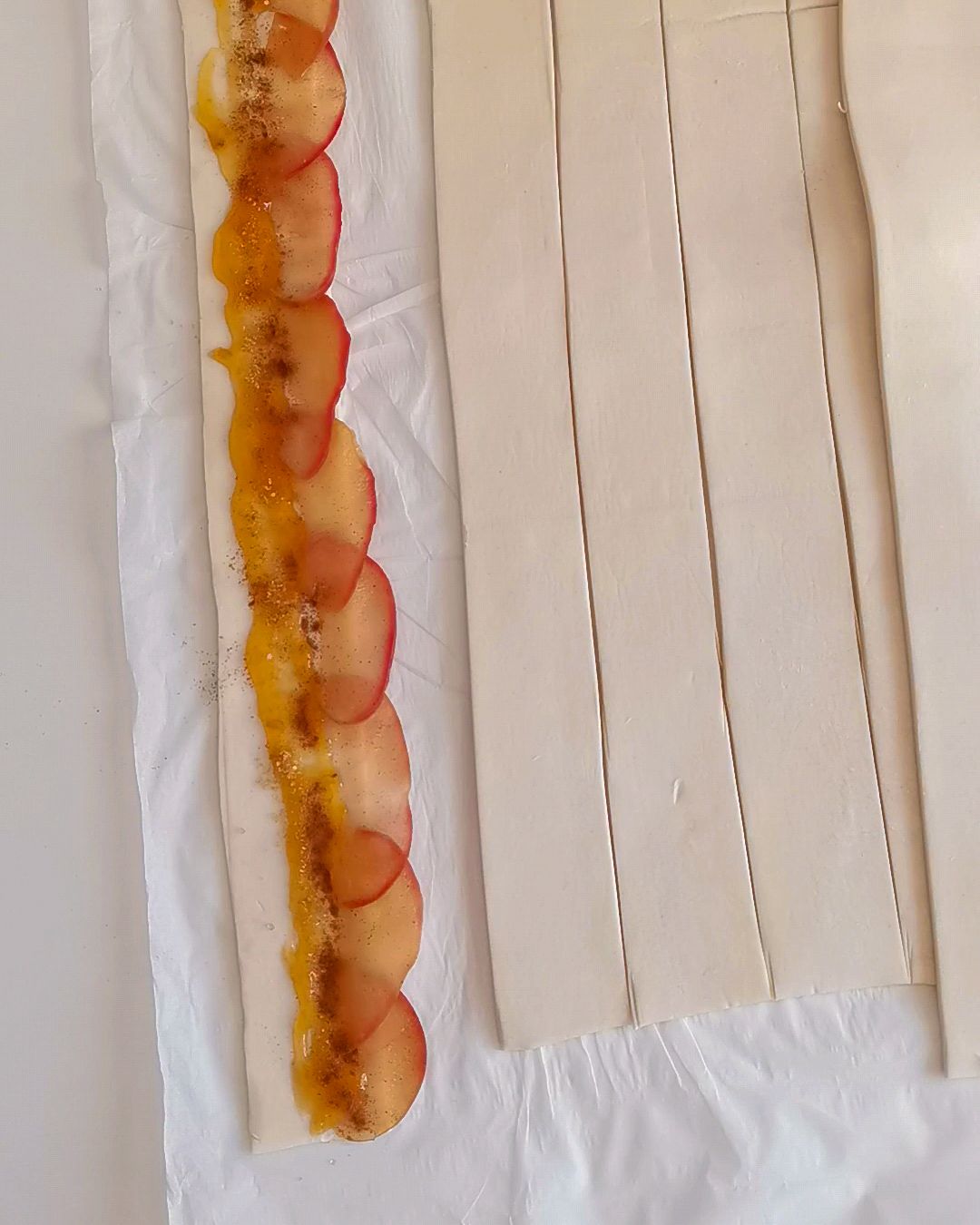 - Dispor ao logo da tira de massa folhada. Juntar doce de alperce, açúcar e canela.