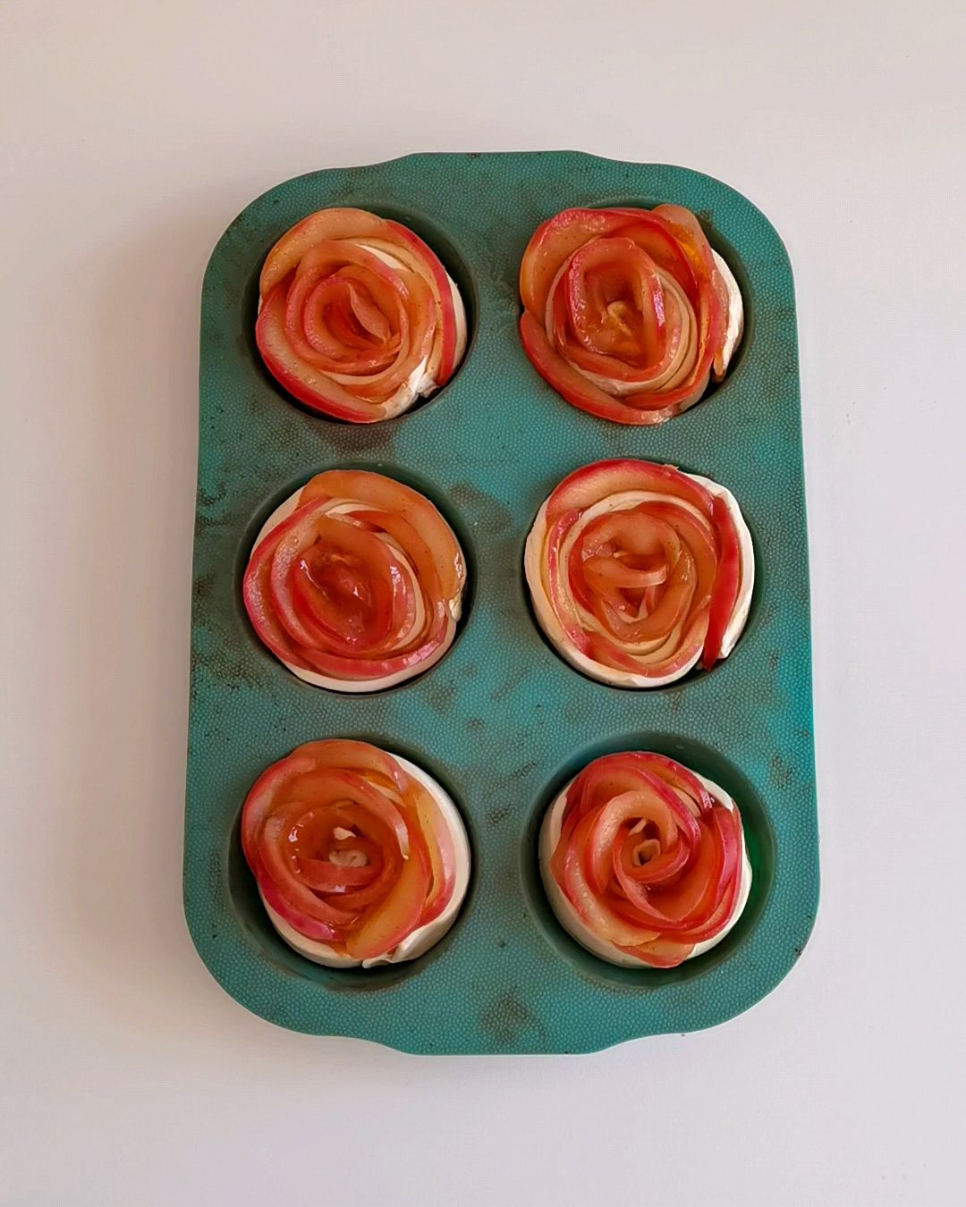 - Pincela uma forma de muffin com óleo e coloca as rosas. Tapa com uma folha de alumínio e leva ao forno por cerca de 30 a 40 minutos. Depende muito do tipo de forno, vai vigiando.