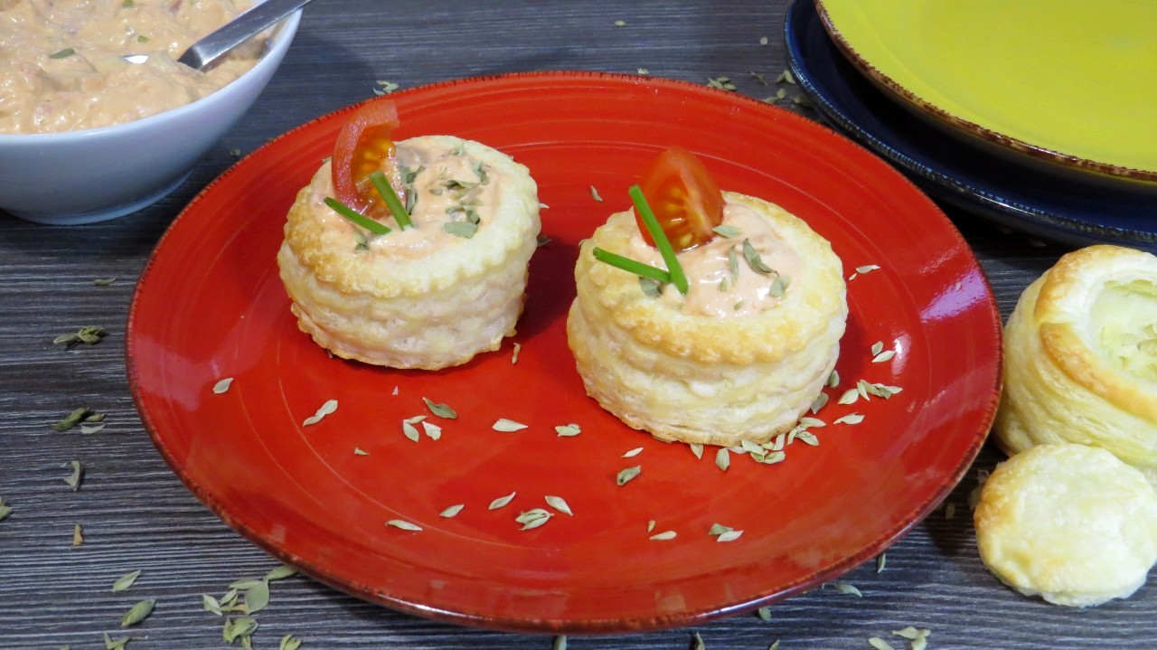 O vol-au-vent estaladiço por fora contrasta com a cremosidade do seu interior. Um creme fresco, de tomate, maionese, orégãos e mais uns ingredientes que tornam esta entrada especial.