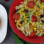 Sirva acompanhado por um arroz natalício composto por arroz, ervilha, cenoura, milho, sultanas e tomates cherry frescos.