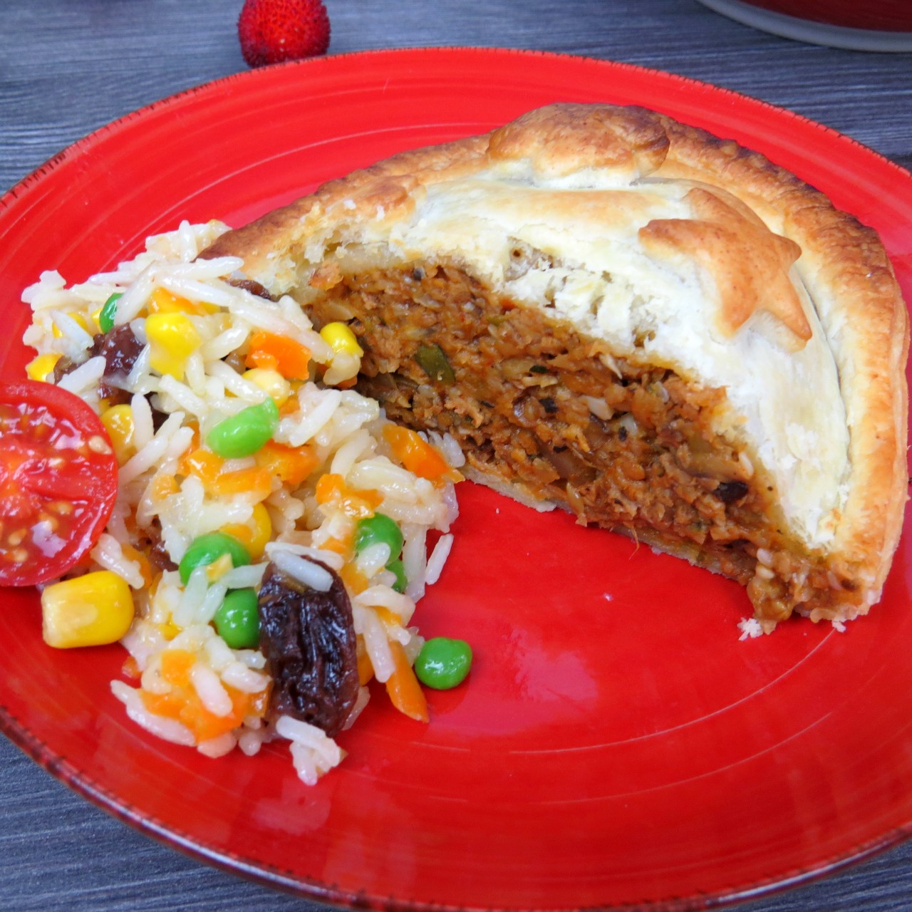 Para o acompanhar sugiro um arroz natalício com ervilha, milho, cenoura, sultanas e uns tomates cherry frescos! Fica uma mesa cheia de cor e bons sabores!
