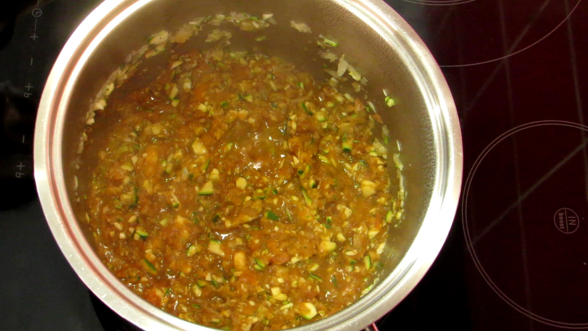 - Adicione o tomate, a curgete, o molho de soja, a polpa de tomate e os cogumelos. Mexa e deixe cozer um pouco para largar os sucos.