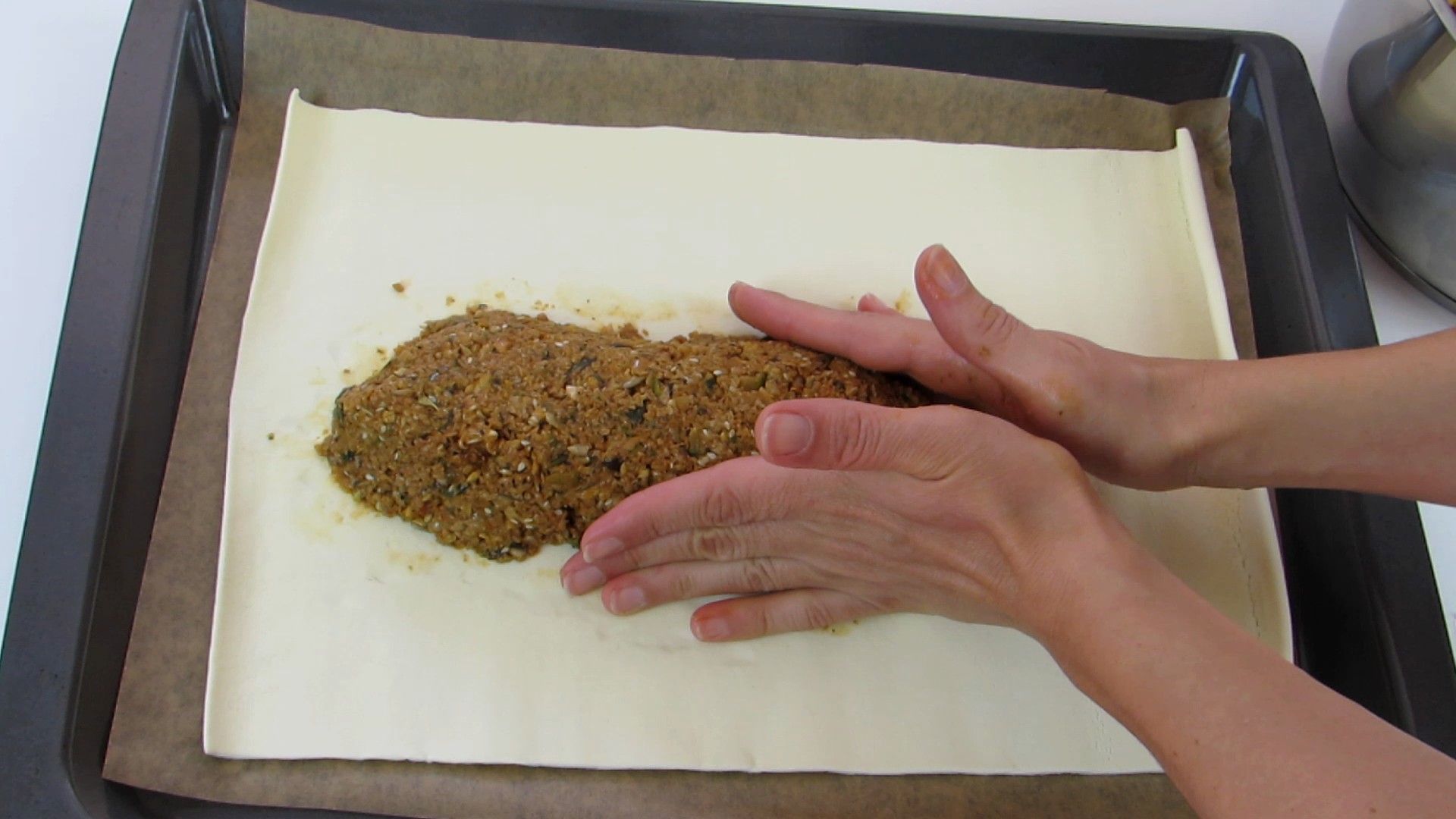 - Num tabuleiro de forno, coloque papel vegetal e estenda uma massa folhada. Coloque o recheio no centro e com as mãos molde um montinho sobre o comprimento da massa folhada.